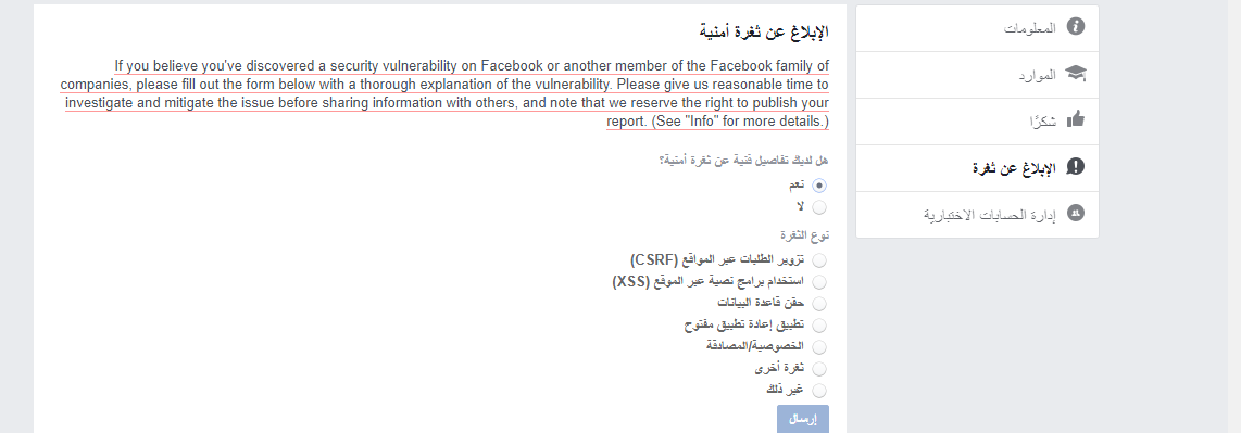حدد نوع الثغرة التى اكتشفتها واتبع التعليمات مع فيسبوك