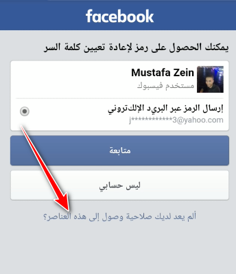 ملاحظه هامه في حالة تعرفك على البريد الالكتروني او رقم الهاتف بعد البحث قم بالضغط على متابعه حتى يصلك رمز استرداد حسابك اما في حالة فقدانك البريد او رقم الهاتف او قام المخترق بتغييرهم قم بالنقر |" لم يعد لديك صلاحية وصول الي هذه العناصر "